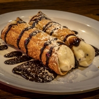 (2) Made Fresh Daily, our Signature Chocolate Chip Cream, Hand Piped into Cannoli Shells, Dusted with Powder Sugar and Chocolate Sauce